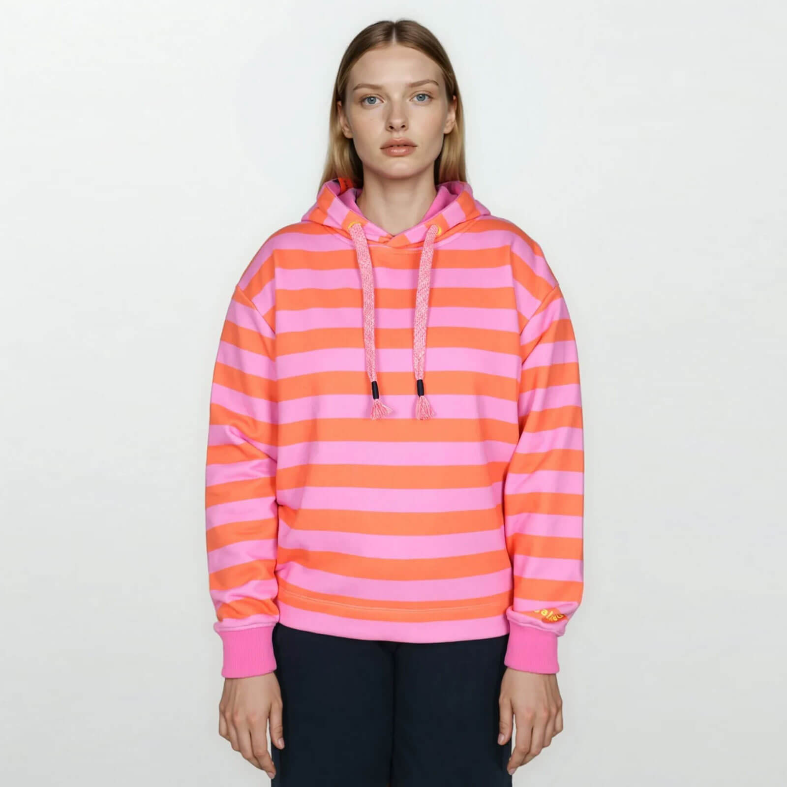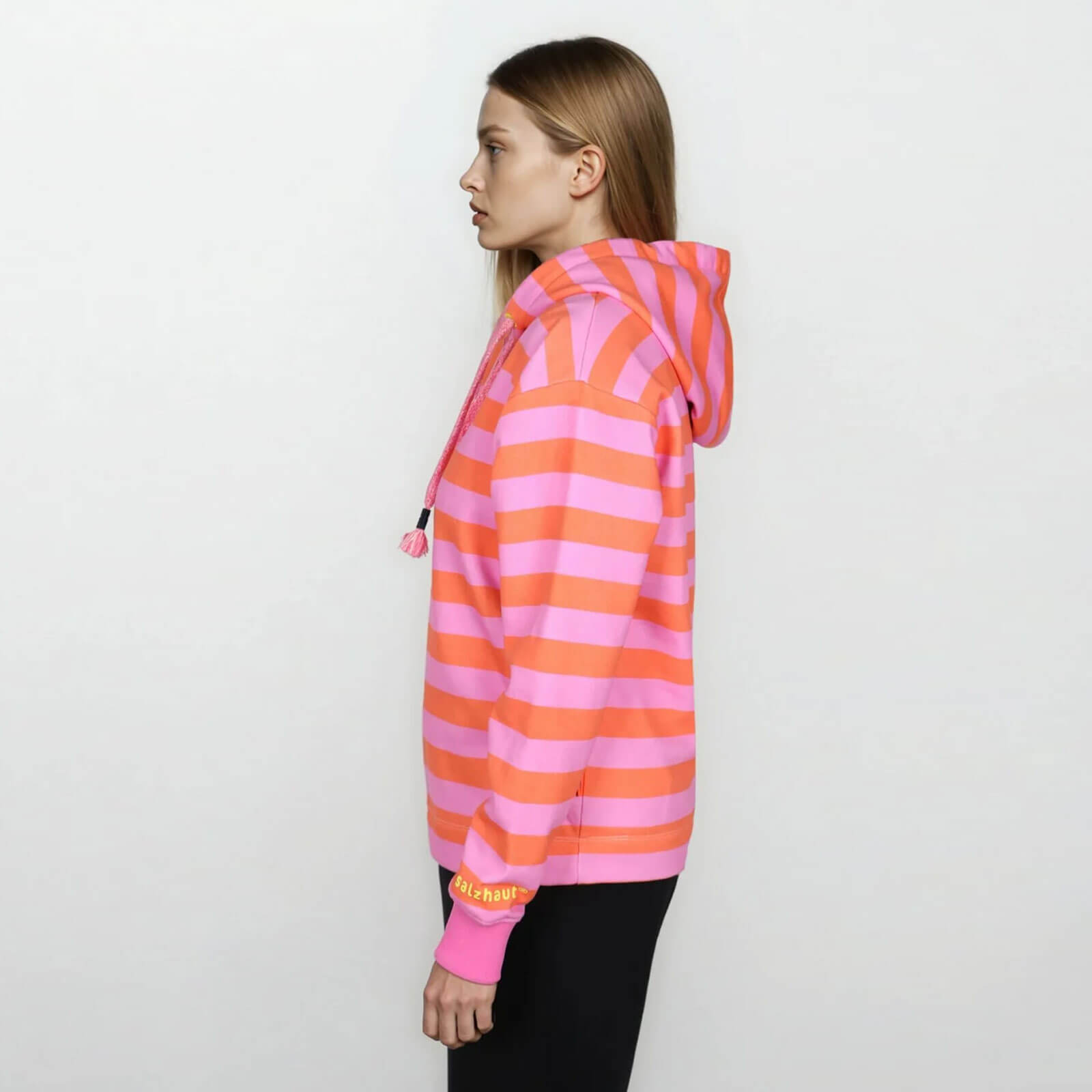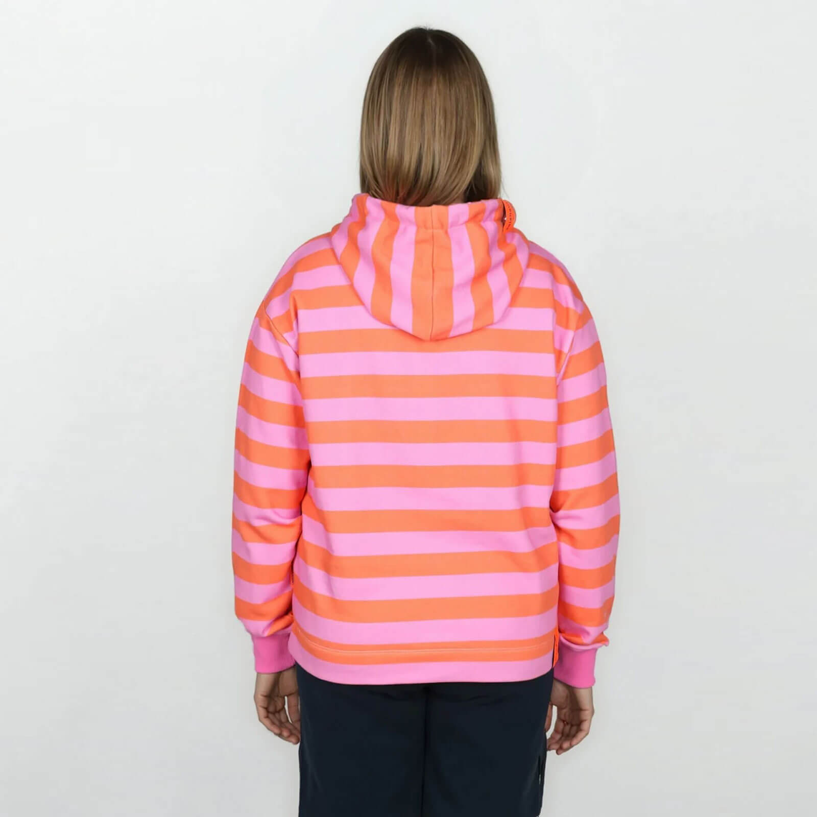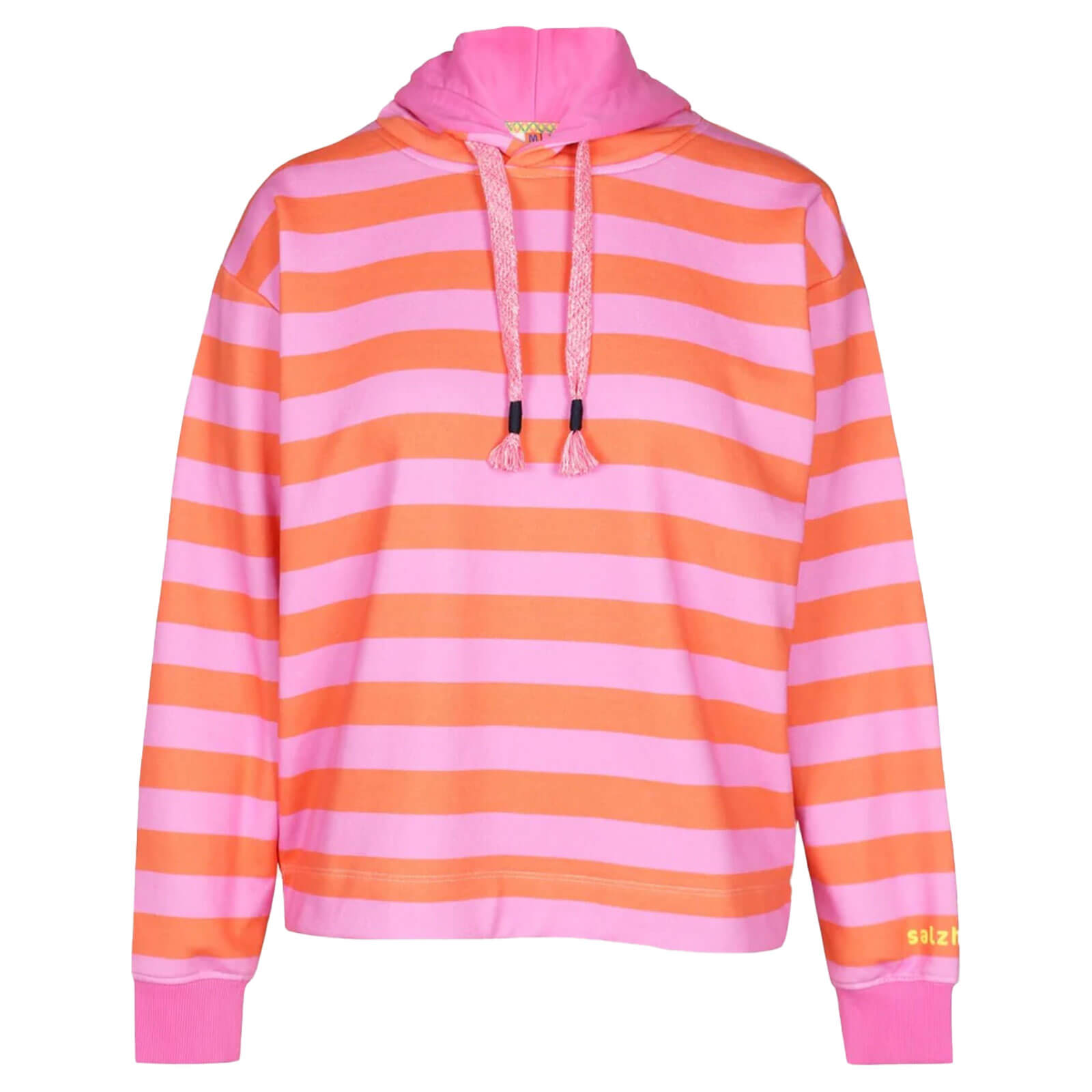 Salzhaut Damen Hoodie Adebaar mit Streifen - Modisch gestreifter Kapuzenpullover in Blossom-Orange Größe S