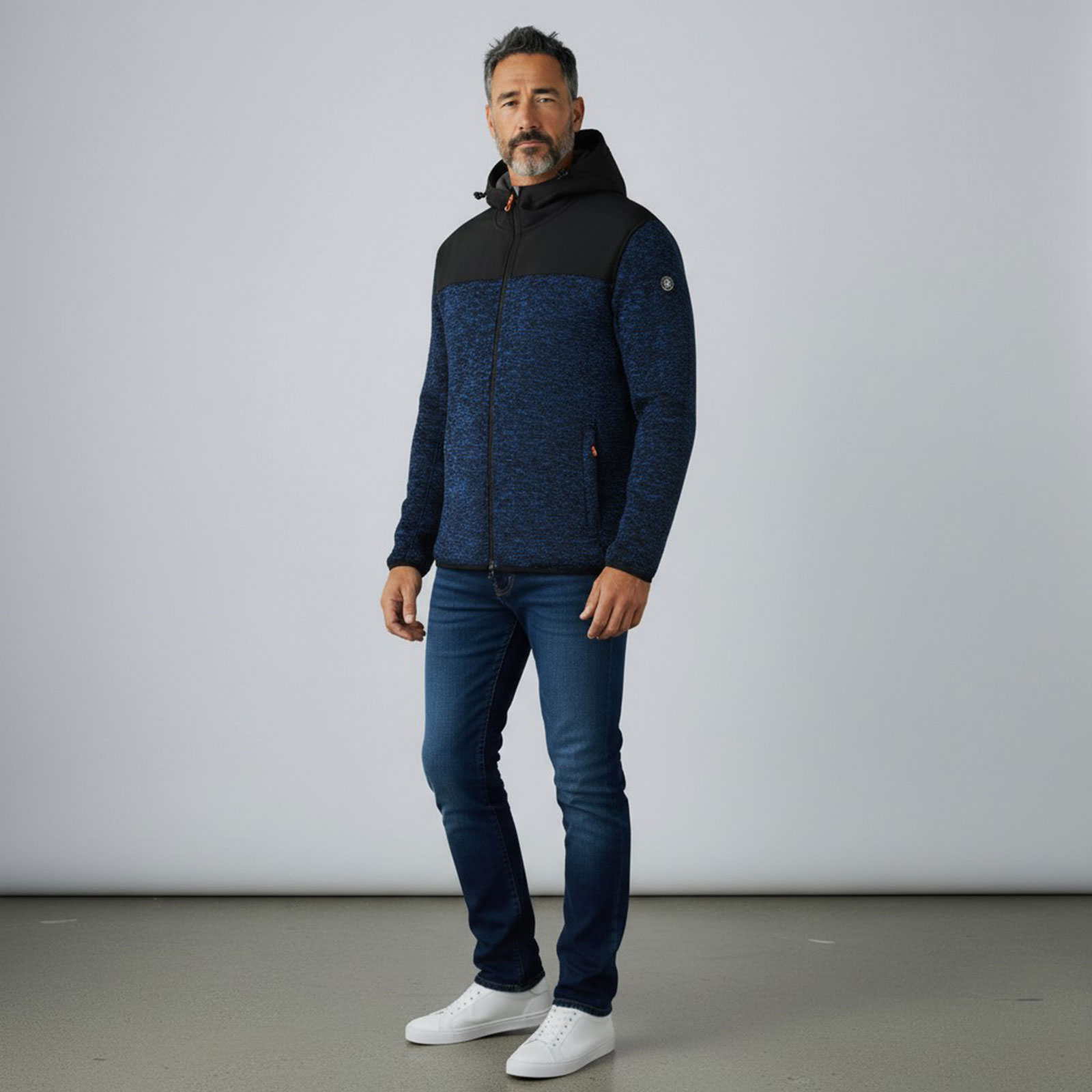 Die Strickoptik verleiht der Jacke einen sportlich-urbanen Look, während das Material mit ca. 300 g/m² angenehm wärmt und gleichzeitig bewegungsfreundlich bleibt. Ideal für Outdoor-Aktivitäten, Freizeit, Arbeit oder als wärmende Zwischenschicht an kühleren Tagen. Besonders beanspruchte Bereiche wie Schultern und Kapuze sind mit Softshell-Material ausgestattet und bieten zusätzlichen Schutz vor Wind und leichten Witterungseinflüssen. Die verstellbare Kapuze ermöglicht eine individuelle Passform, während der 2-Wege-Frontreißverschluss maximale Flexibilität im Alltag bietet – ob im Sitzen, Gehen oder bei aktiven Bewegungen. Praktische Außentaschen mit Reißverschluss sorgen für sicheren Stauraum für Smartphone, Schlüssel oder Geldbörse. Der Elastikabschluss an Ärmeln und Bund garantiert einen optimalen Sitz und hält die Wärme zuverlässig am Körper. Zipper-Puller in Kontrastfarbe sowie eine dezente Applikation am Arm unterstreichen den modernen, sportlichen Charakter dieser Fleecejacke.