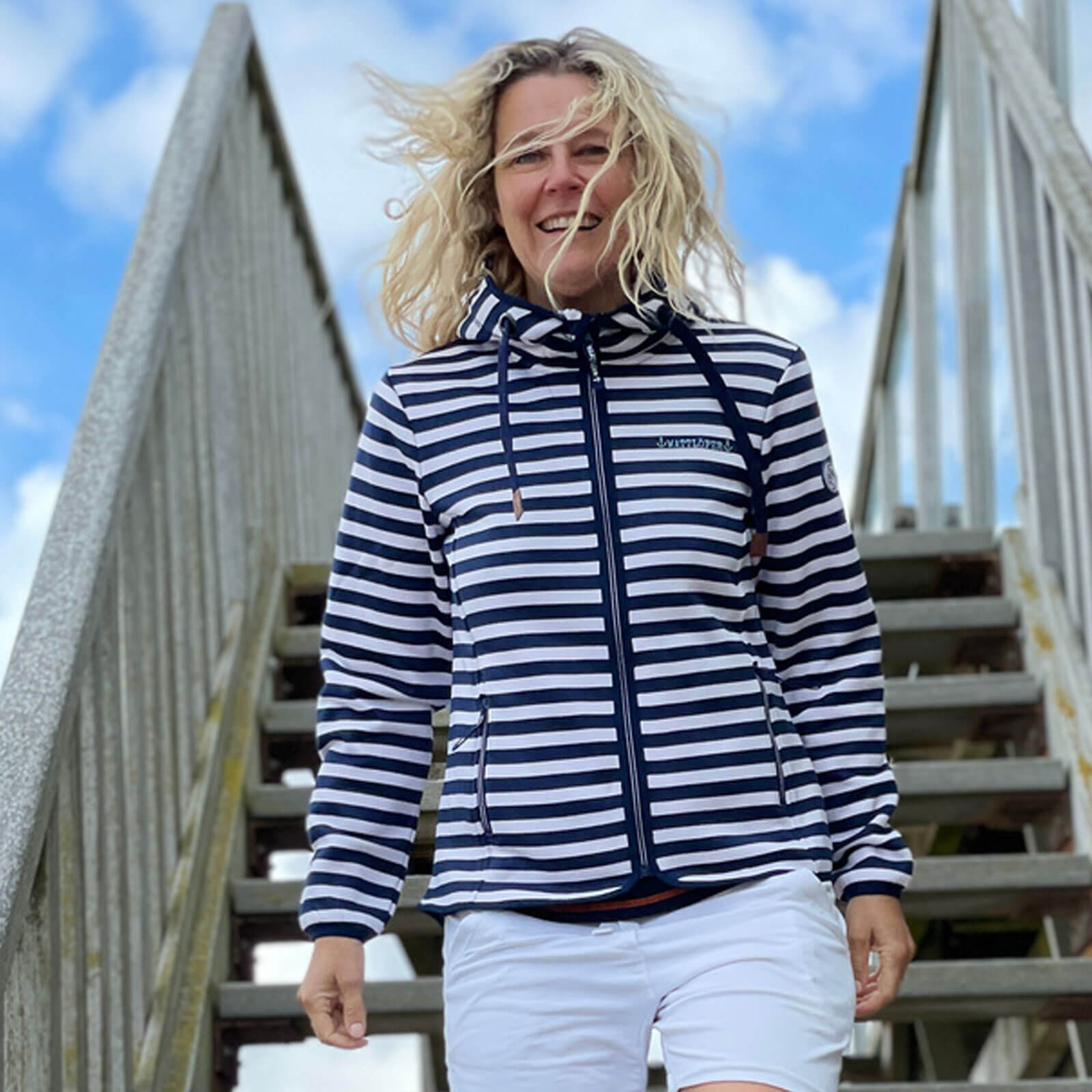 Diese gestreifte Strickfleecejacke für Damen von Wattlöper verbindet maritimen Stil mit funktionalem Tragekomfort.