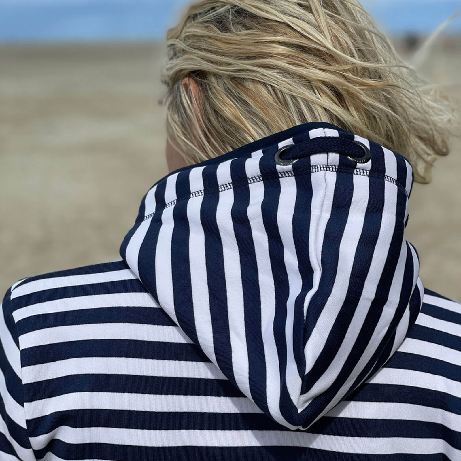 Wattlöper Damen Strickfleecejacke im Streifen-Design - Gestreifte Fleecejacke mit Kapuze in Dunkelblau-Weiß Größe XS