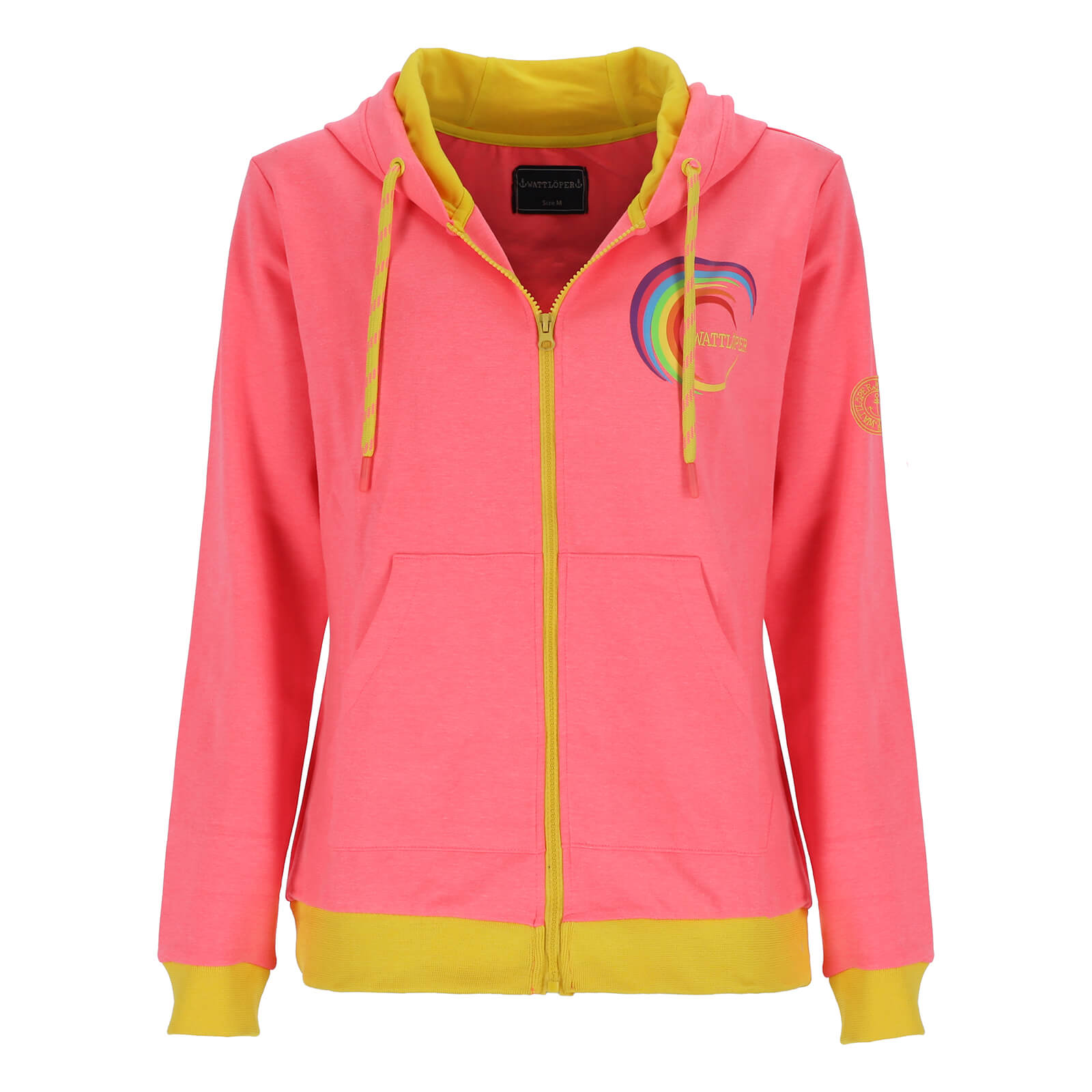 Wattlöper Damen Sweatjacke mit rundem Backprint in Regenbogen-Farben - Kapuzenjacke mit Reißverschluss in Pink Größe L
