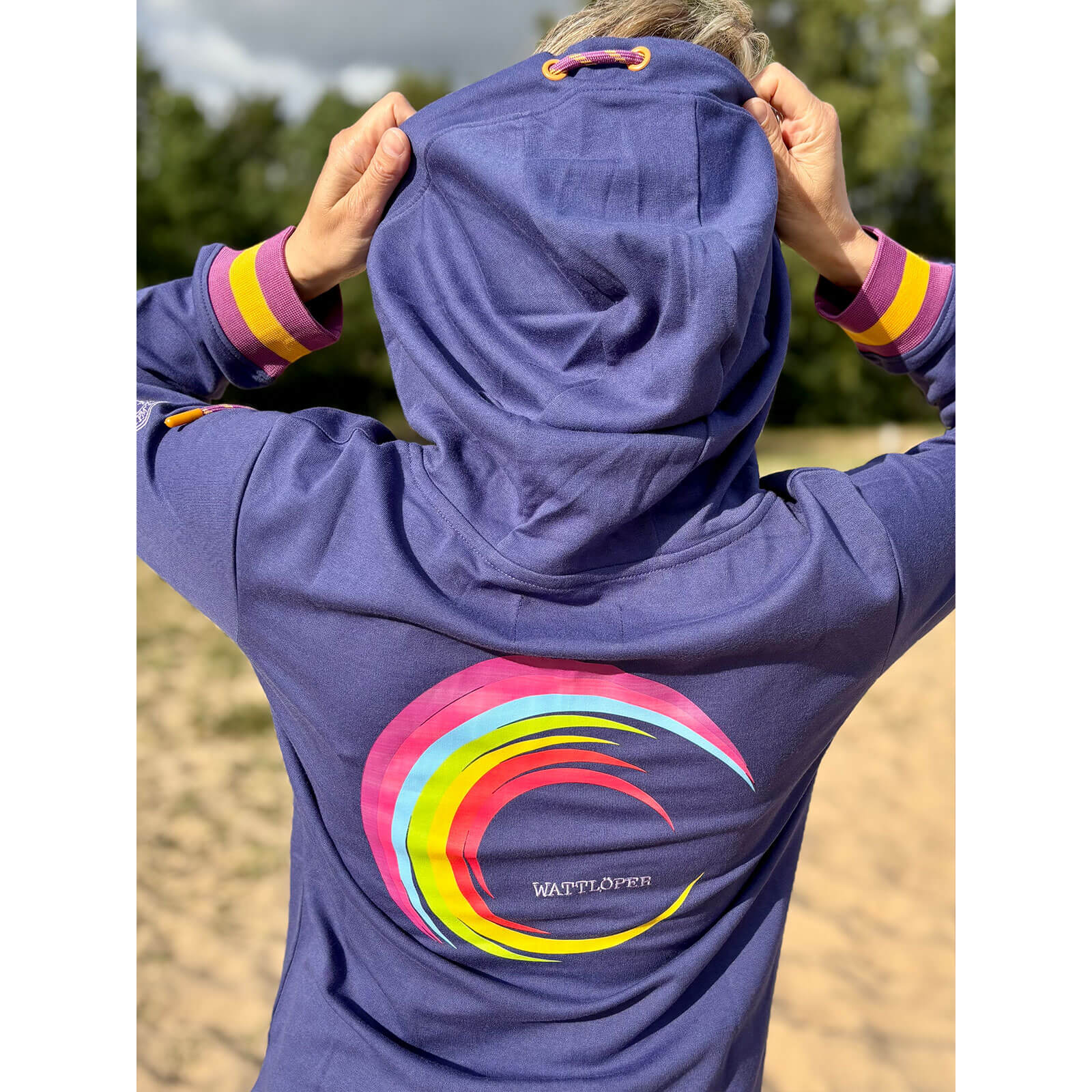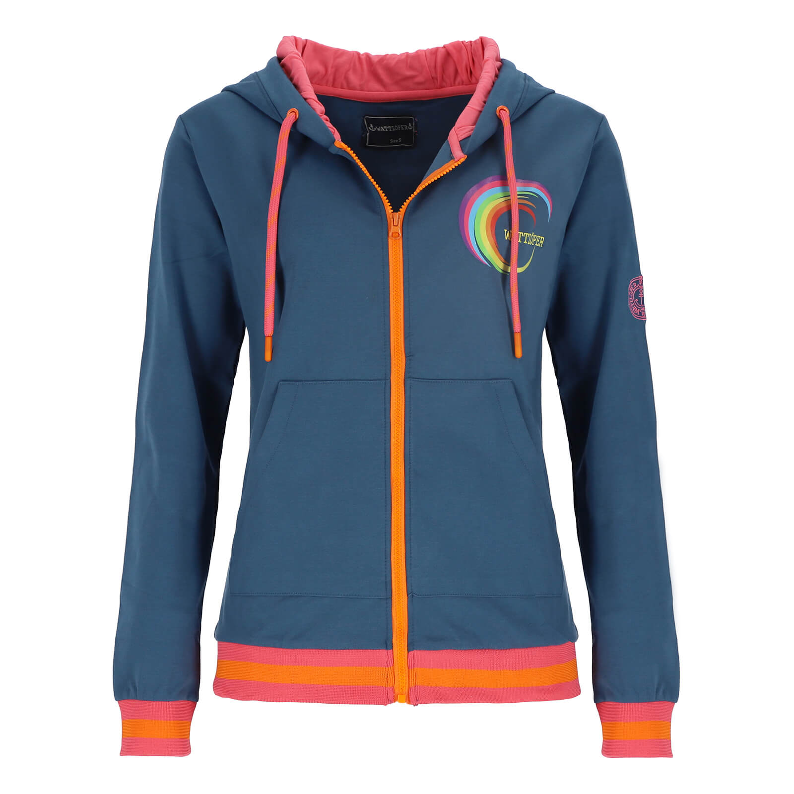 Wattlöper Damen Sweatjacke mit rundem Backprint in Regenbogen-Farben - Kapuzenjacke mit Reißverschluss in Dunkelblau Größe M