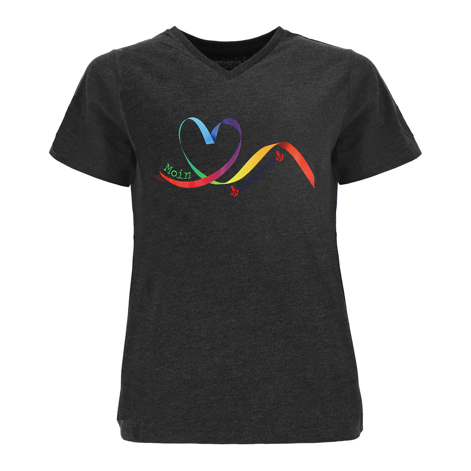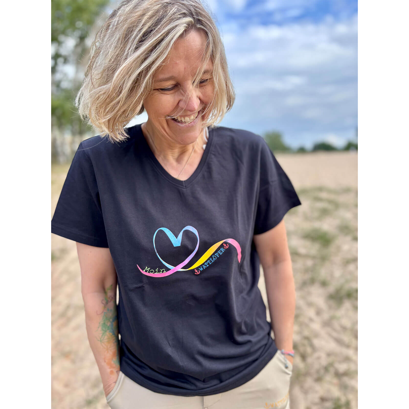Wattlöper Damen T-Shirt mit Schleifen-Herz-Print und Moin-Stickerei - Kurzarm-Shirt mit V-Ausschnitt